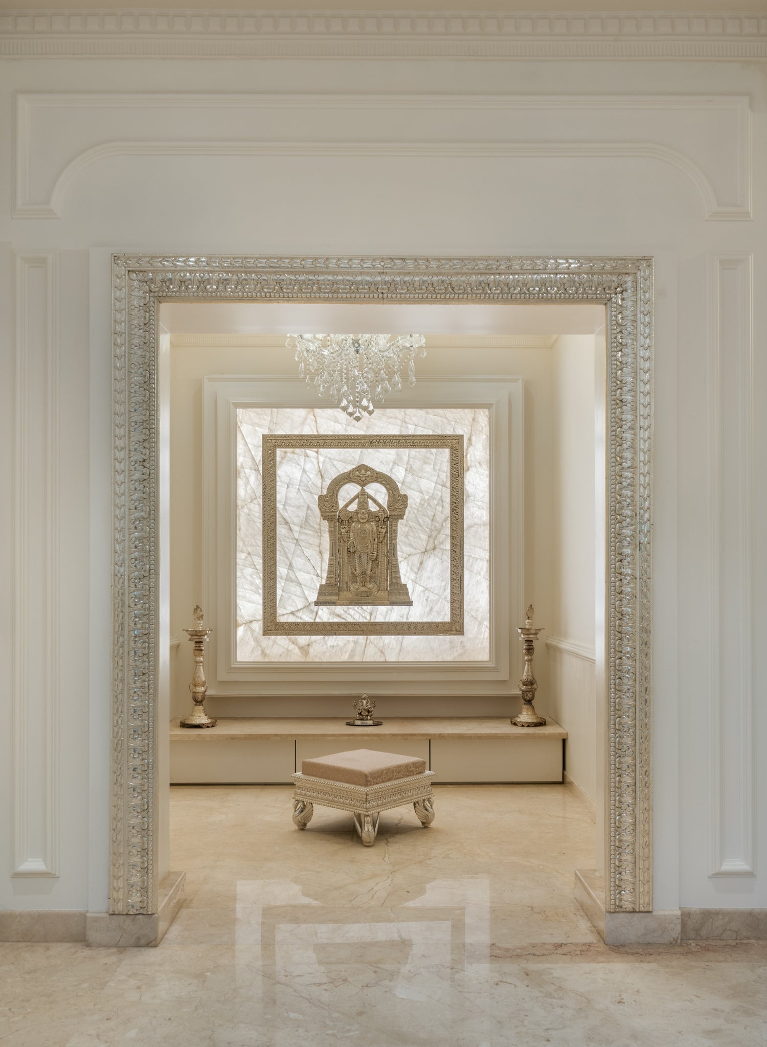 Our exclusive pooja room features the Frames and Idols in Silver. Handcrafted from Old Building Teak Wood, they embody a story of resilience and timelessness. These are then clad in 99.9% pure silver, creating a radiant aura that reflects light and positivity into the surrounding space.