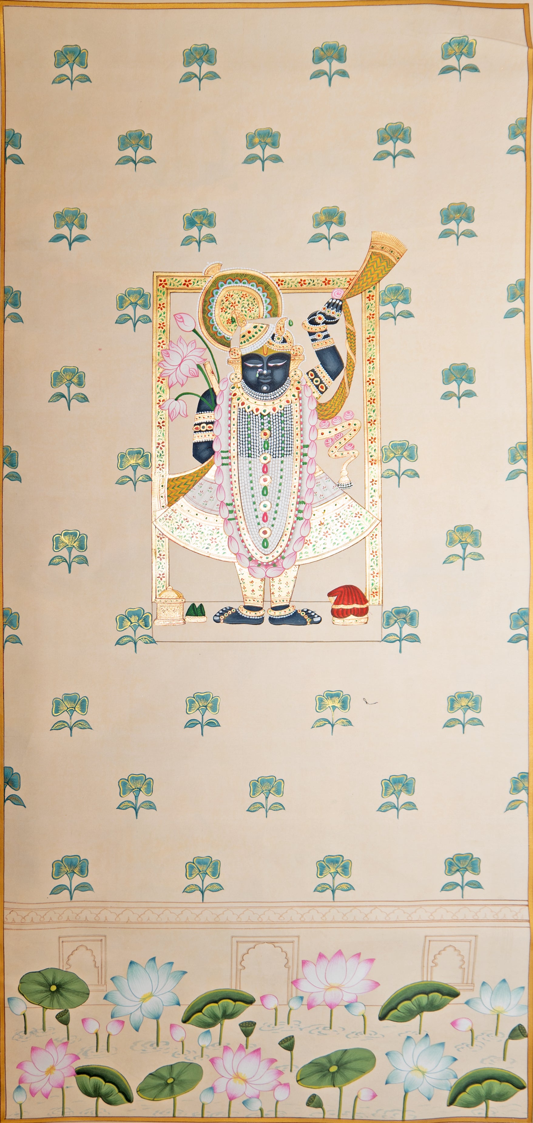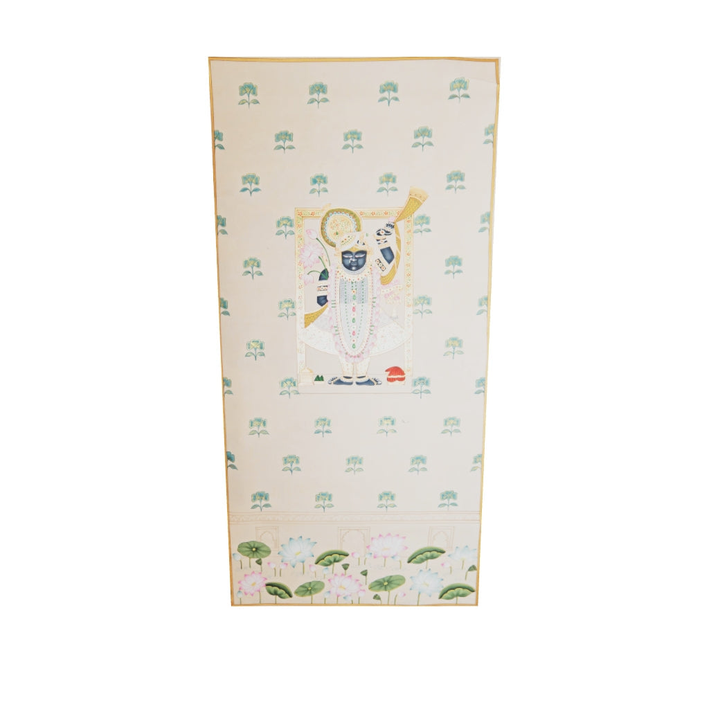 At the heart of the painting, Shrinathji is adorned in delicate jewels, floral garlands, and intricate attire, holding the Govardhan hill a symbol of divine protection and grace. The composition is framed with soft-toned hand-painted lotuses and trees, representing purity, devotion, and spiritual growth.