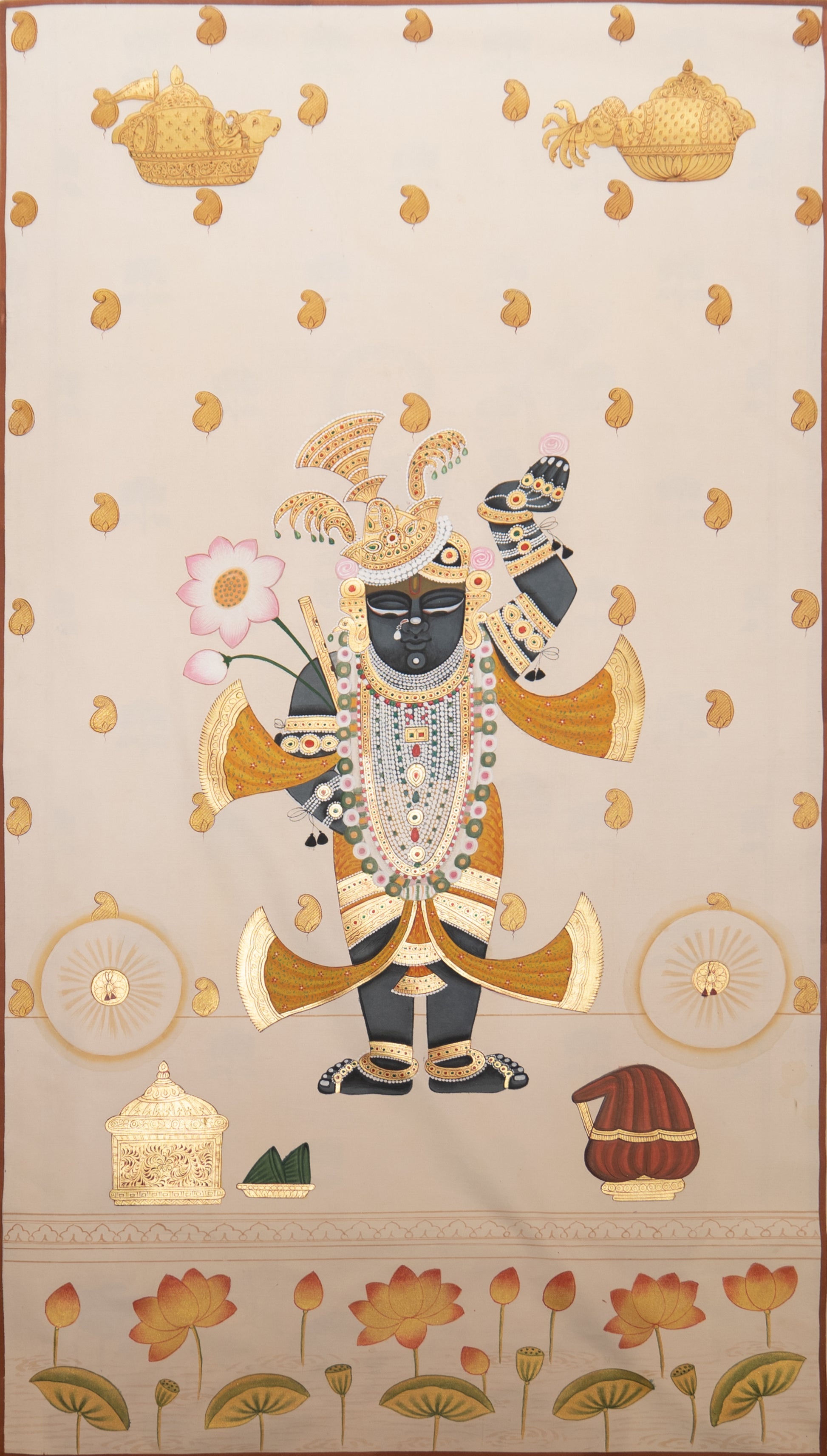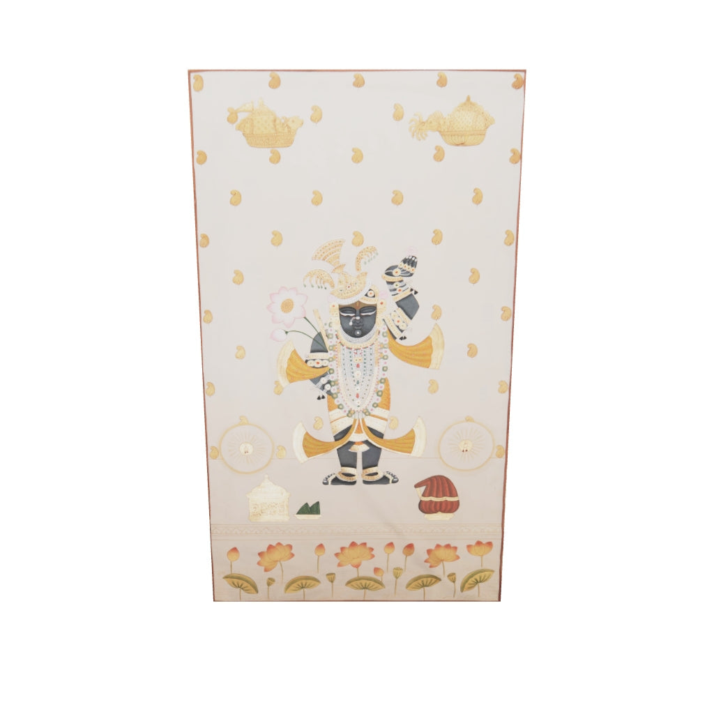 At the centre of this handcrafted Pichwai painting, Shrinathji stands in divine elegance, holding a lotus flower and the Govardhan hill, surrounded by elements of abundance gold pots, lotus motifs, and intricate detailing that evoke spiritual grace. Each stroke is carefully hand-painted using natural pigments and delicate gold accents, bringing a luminous, elevated quality to the piece.