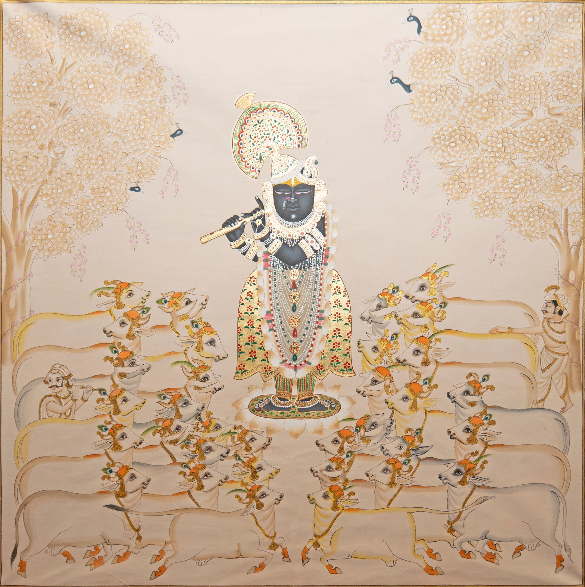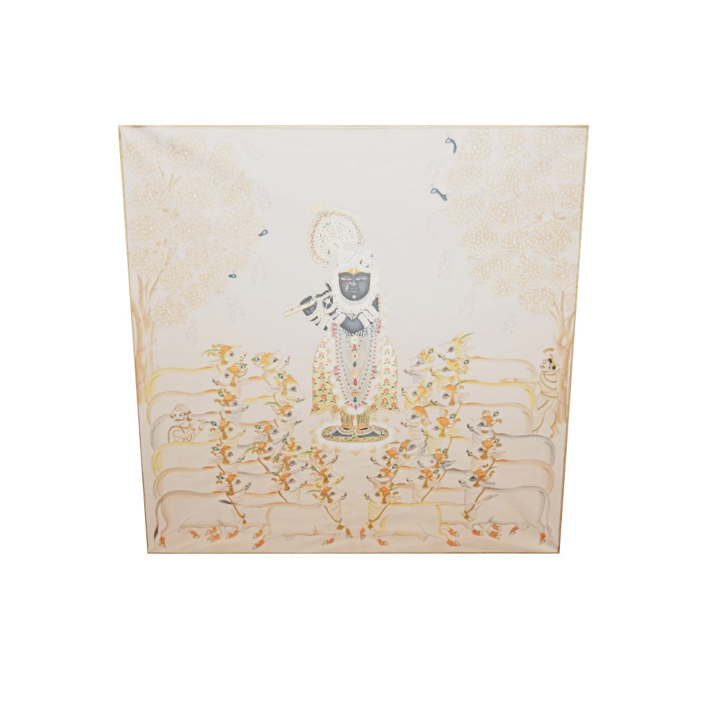 The beige festival painting is hand painted with organic dyes, which reimagines and depicts the Gopal Ashtami festival that takes place in late autumn. The gold leaf detailing enhances its aesthetics.
