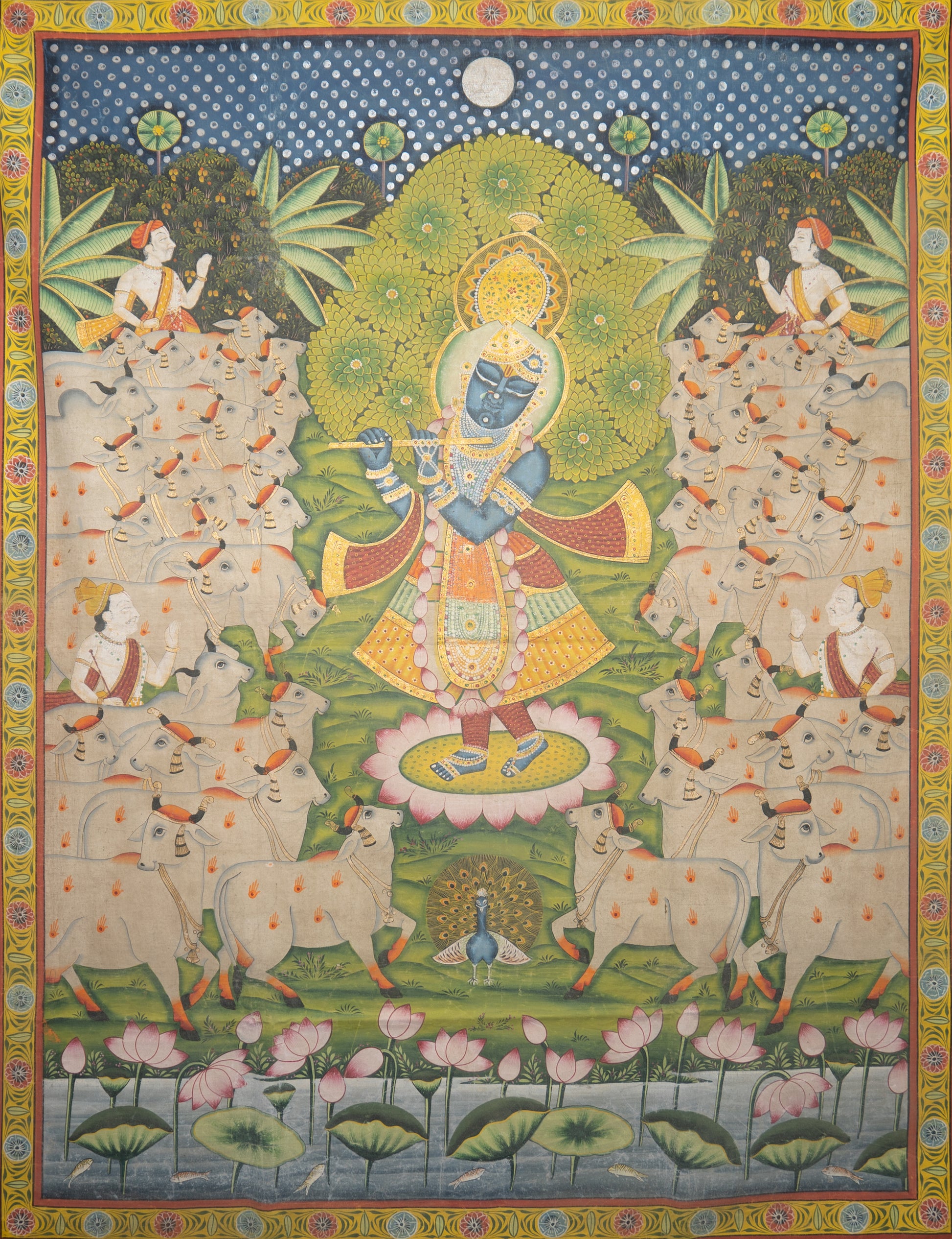 The composition’s layered symbolism lotus for enlightenment, cows for prosperity, and the moon for divine calm make this piece both spiritual and majestic. Every detail, from the hand-dotted celestial sky to the delicate borders, mirrors the meditative precision of traditional Pichwai craftsmanship.
