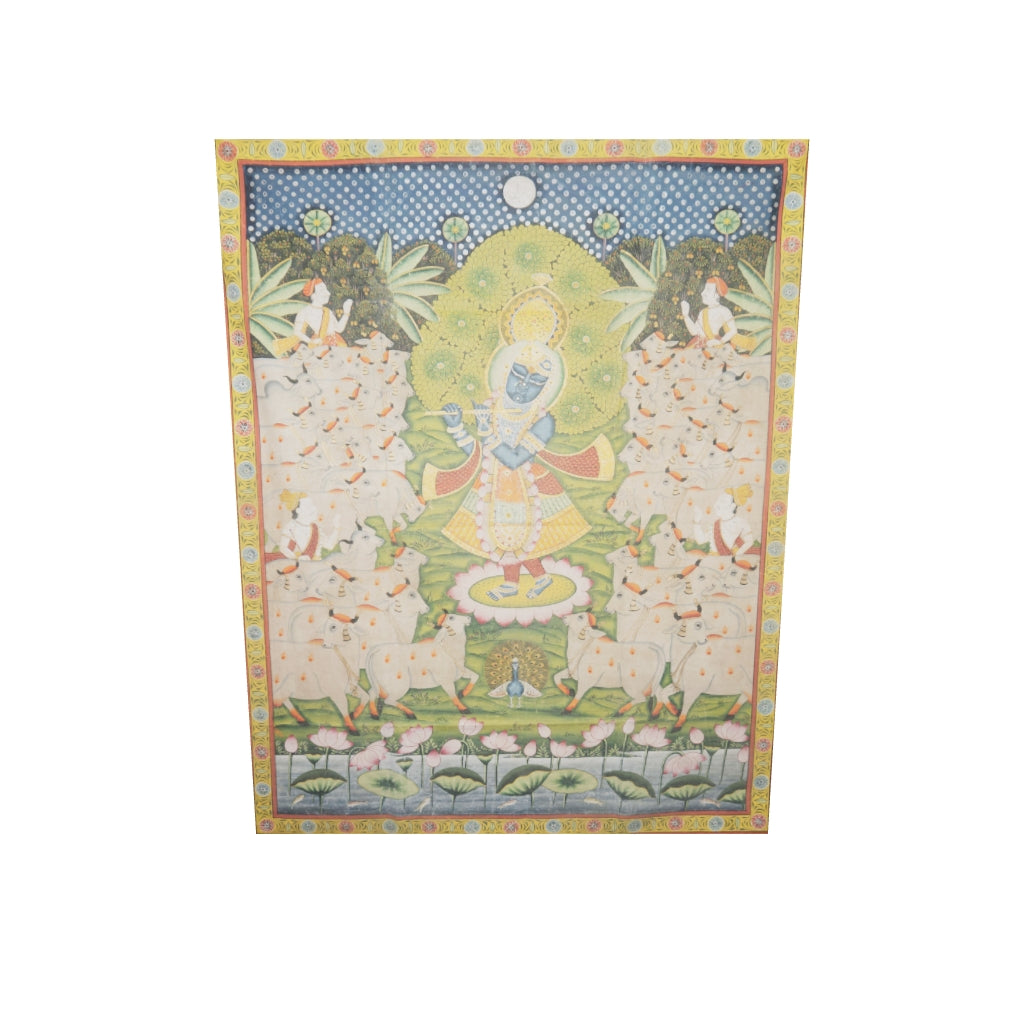 At the heart of the painting, Shrinathji stands poised on a blooming lotus, playing his flute a symbol of cosmic rhythm and divine harmony. Around him, beautifully hand-painted cows gaze in devotion, representing purity, abundance, and spiritual protection. The lush greenery, golden tones, and full moon evoke the sacred energy of Vrindavan, where Krishna’s presence sanctifies nature itself.