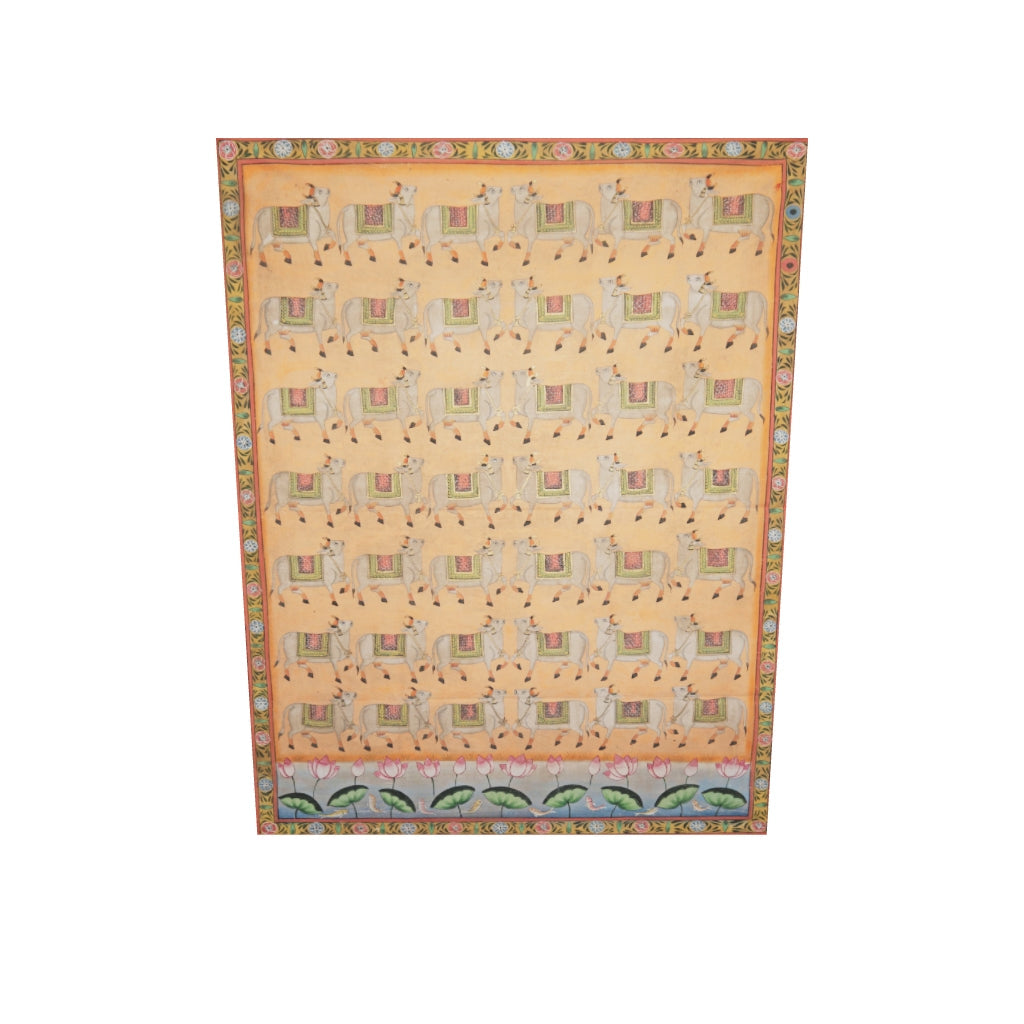 This Pichwai painting features rows of hand-painted cows, each detailed with precision and adorned with ornate textiles in soft shades of gold, ivory, and green. The repetition of form represents abundance, devotion, and the rhythmic harmony of divine order key themes in traditional Nathdwara Pichwai art.