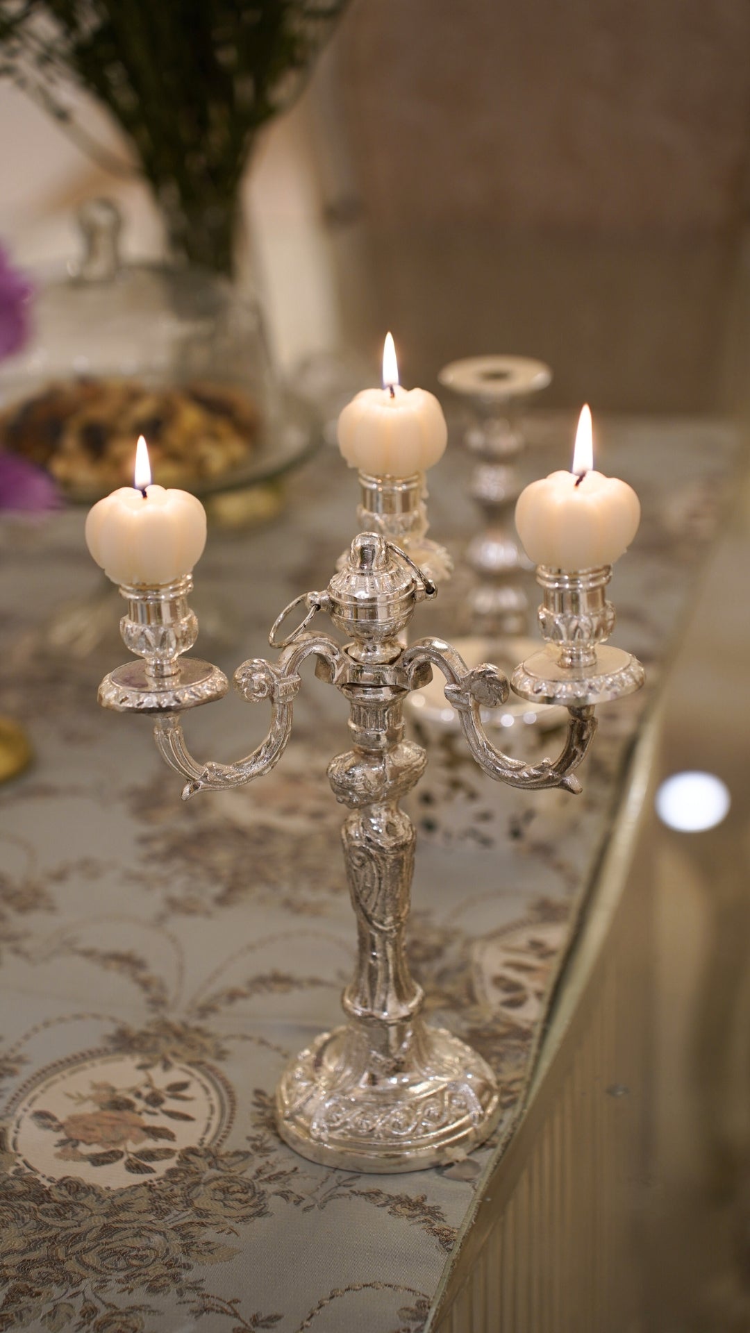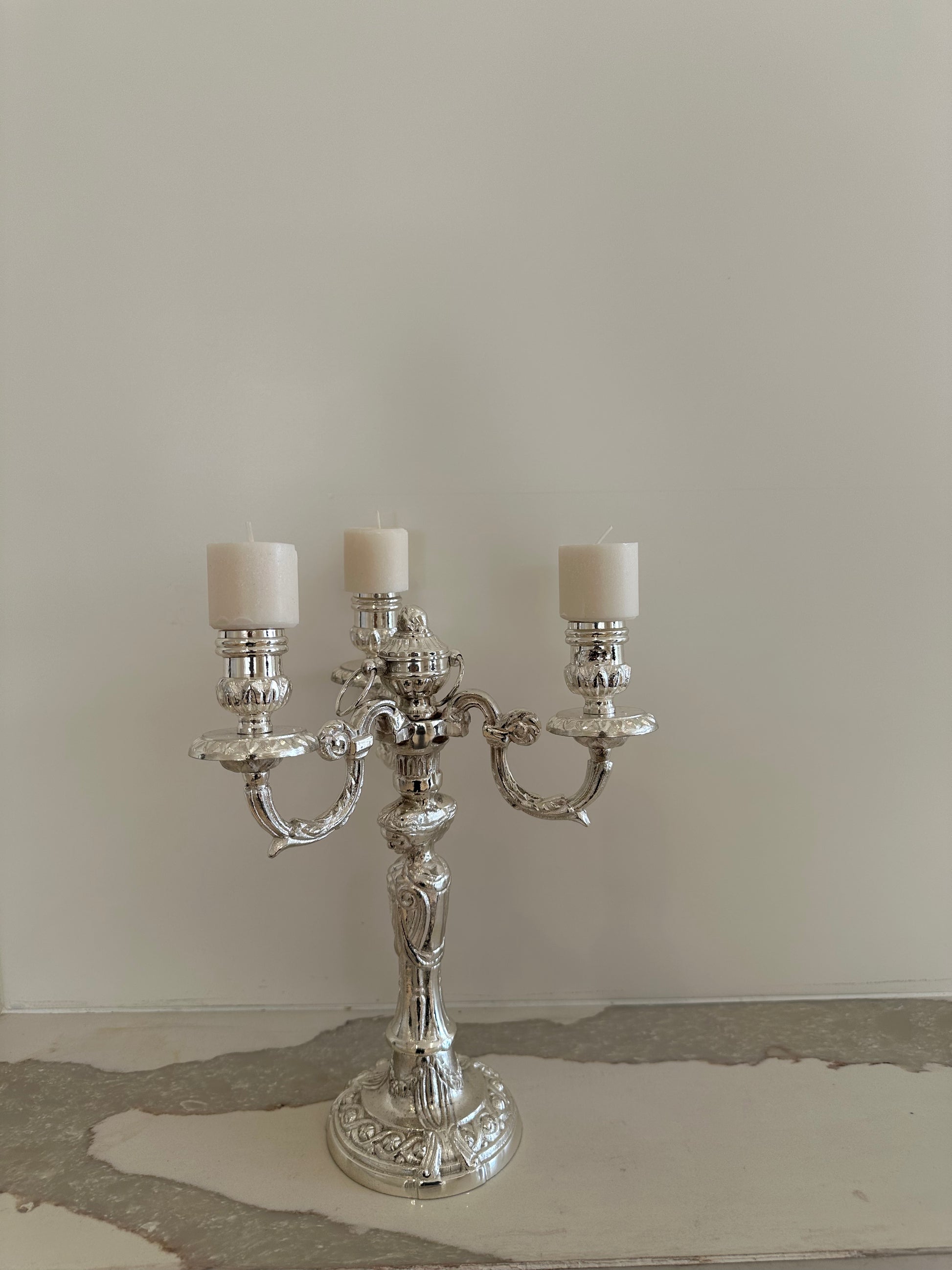 This Elise candle stand is our intricately designed silver coated candle holders, inspired by the Victorian era. The perfect center piece to add to your festive décor.