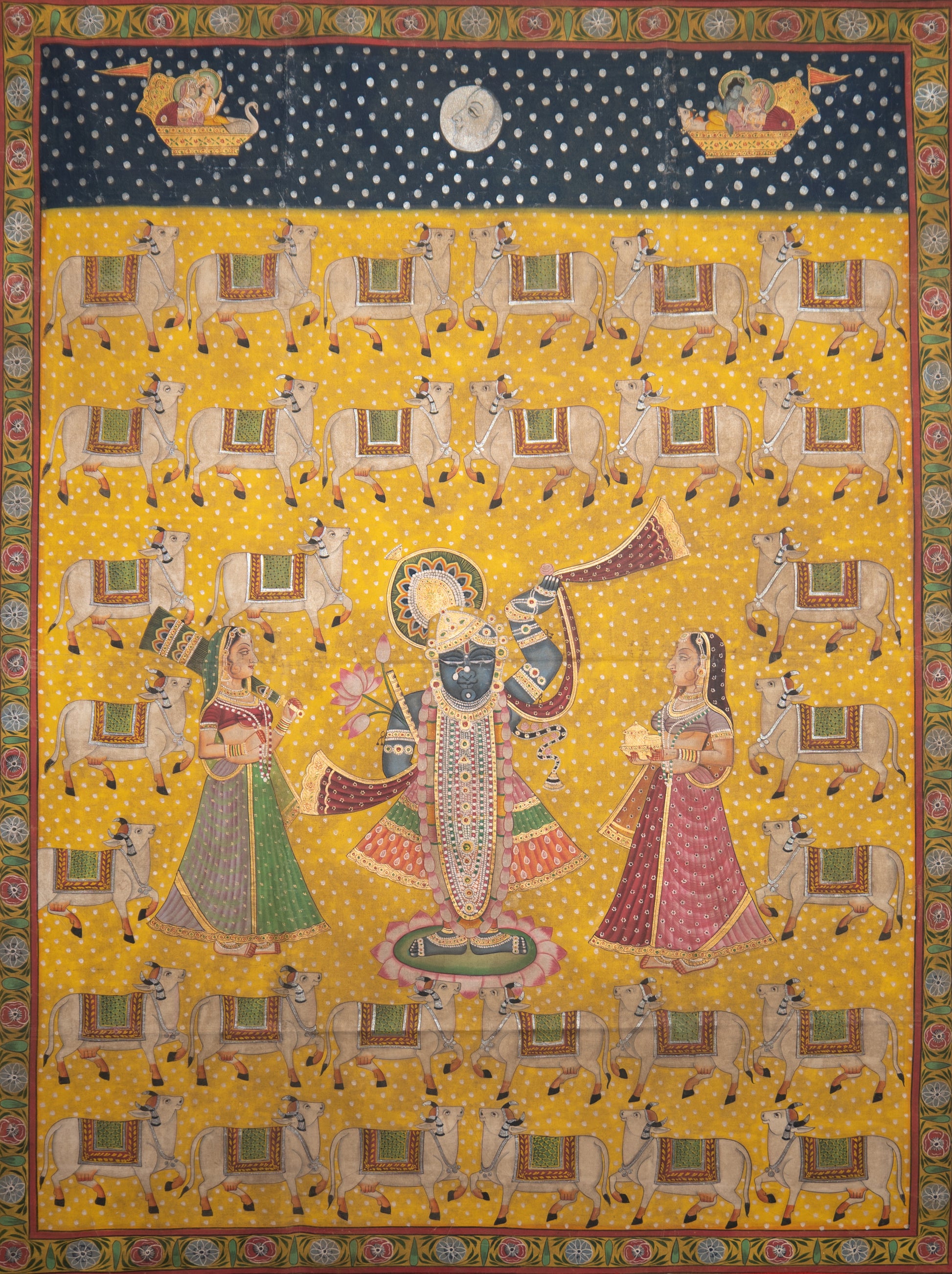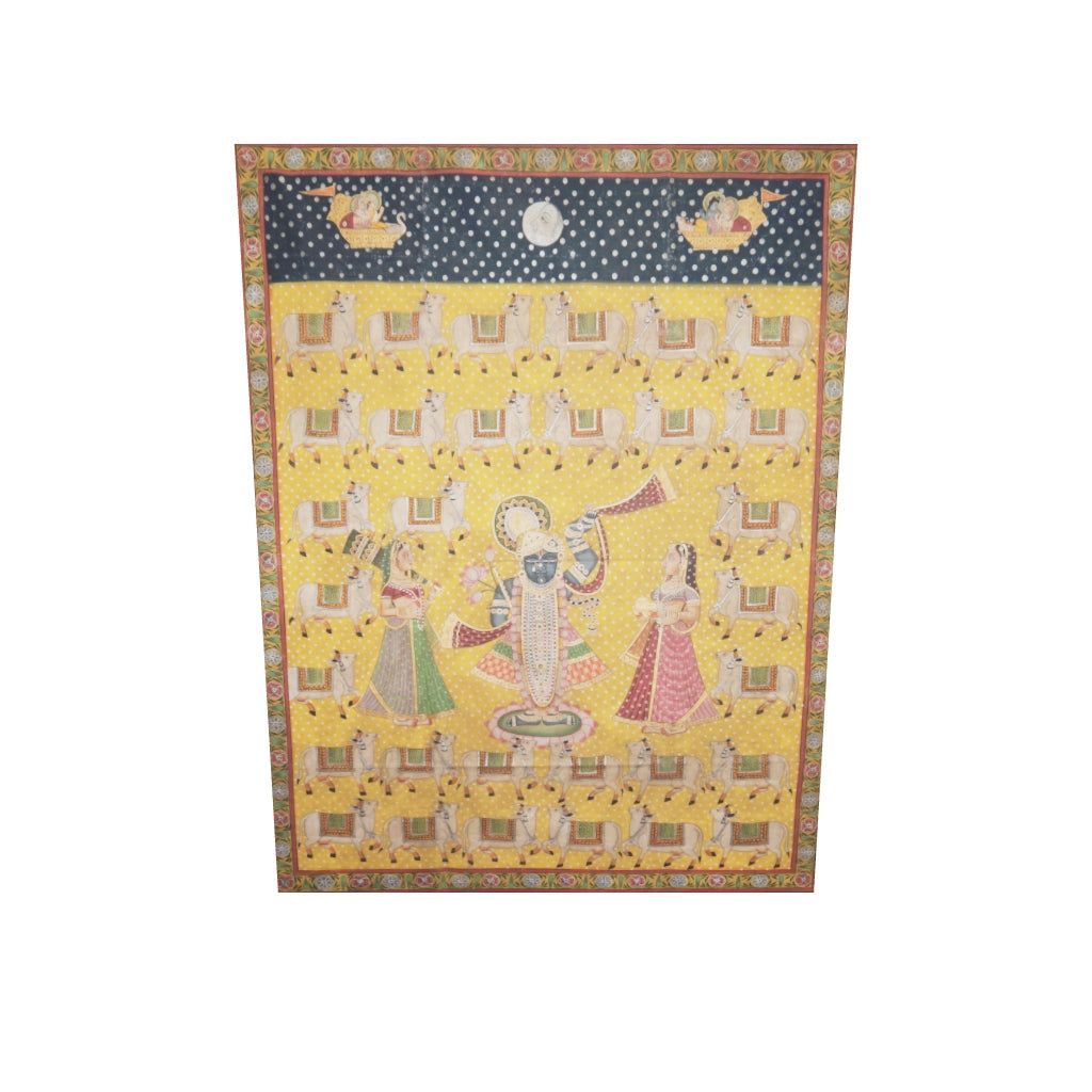 Surrounding him are beautifully hand-painted cows, sacred symbols of prosperity and devotion in Indian tradition. The gopis on either side embody reverence and joy, while the celestial chariots above under a full moon illuminate the divine narrative. The golden-yellow background, richly textured with delicate motifs, radiates warmth, positivity, and luxury a hallmark of traditional Pichwai craftsmanship.
