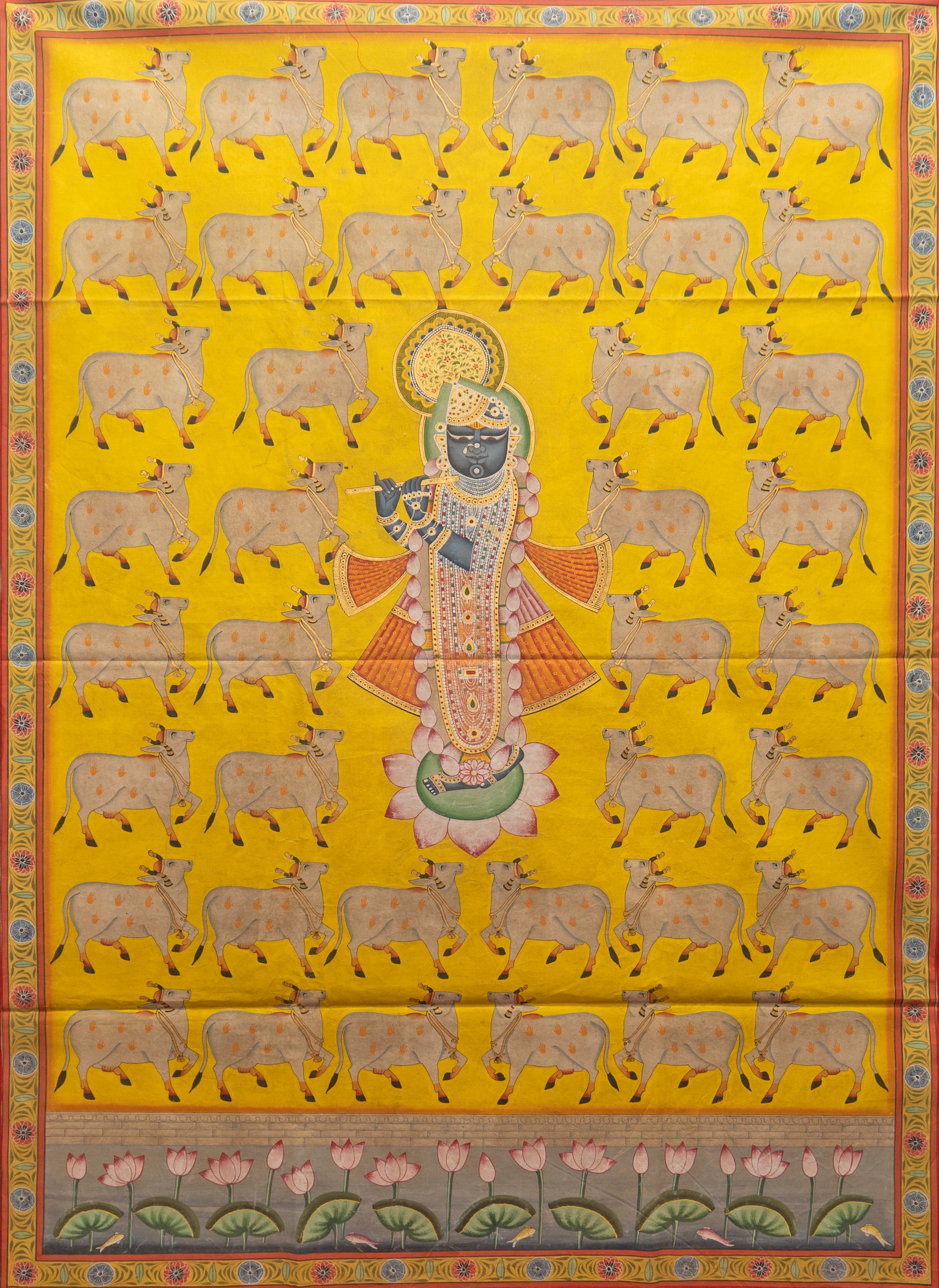 The ochre hues painting depicts the festival of cattle during the summer, it has a tinge of the ochre background to give the painting a sense of earthiness to it.