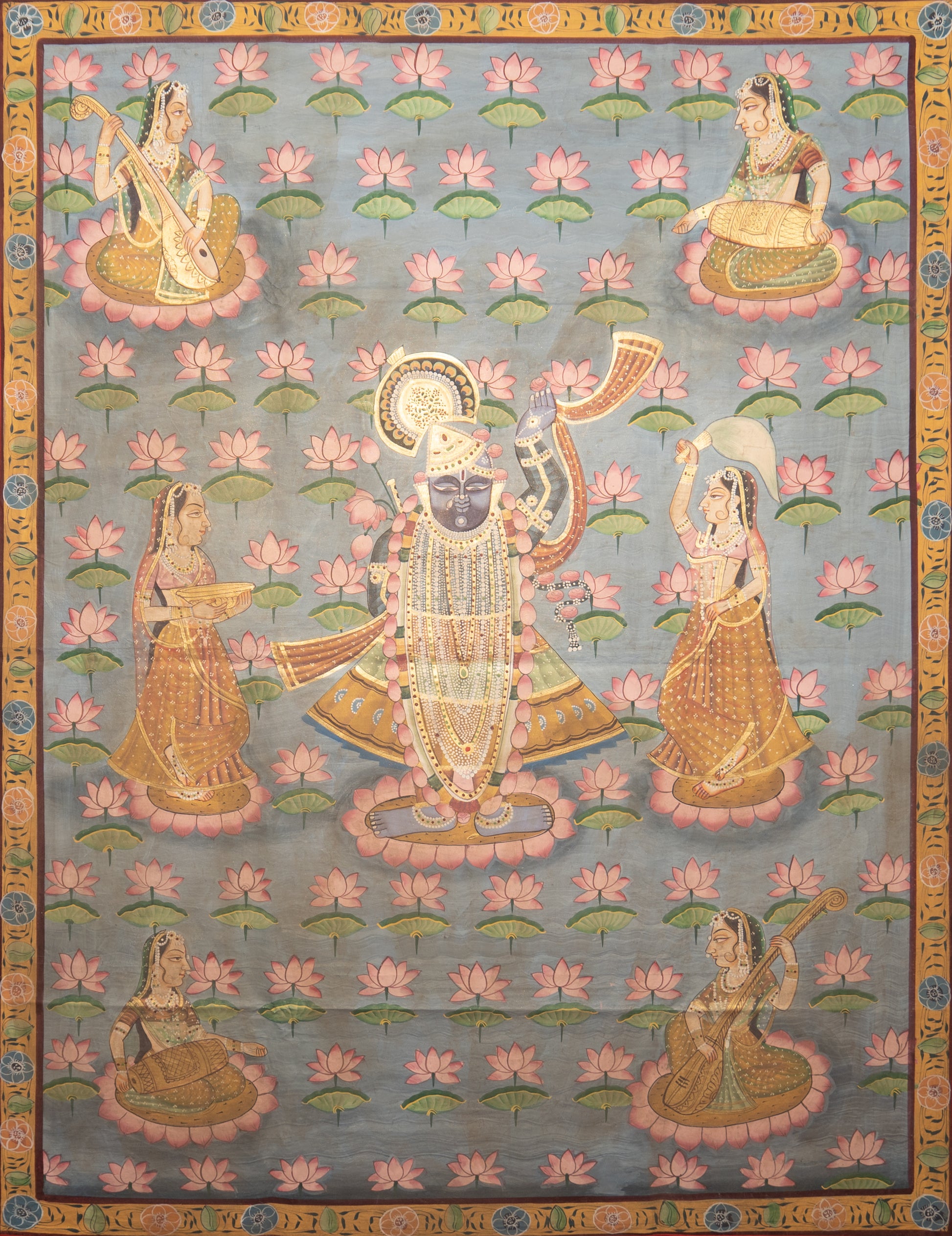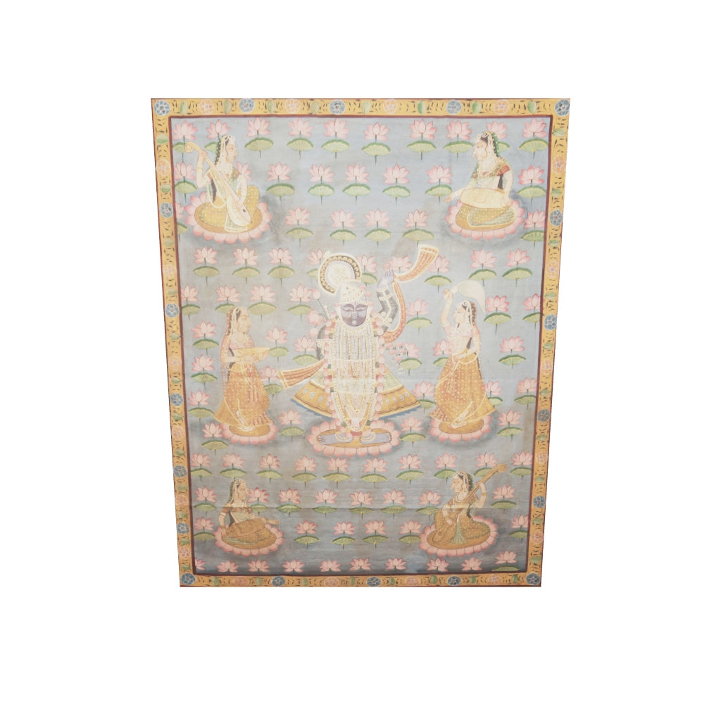 The Revering Melody by Khenshu is a magnificent handcrafted Pichwai painting that beautifully captures the sacred offerings made to the Lord. Each intricate floral motif and delicate gold detail is meticulously handcrafted, reflecting centuries of traditional Indian devotional artistry. This Pichwai painting embodies both spiritual devotion and cultural heritage, making it a treasured piece for collectors, art enthusiasts, and anyone seeking to infuse their space with elegance and reverence.