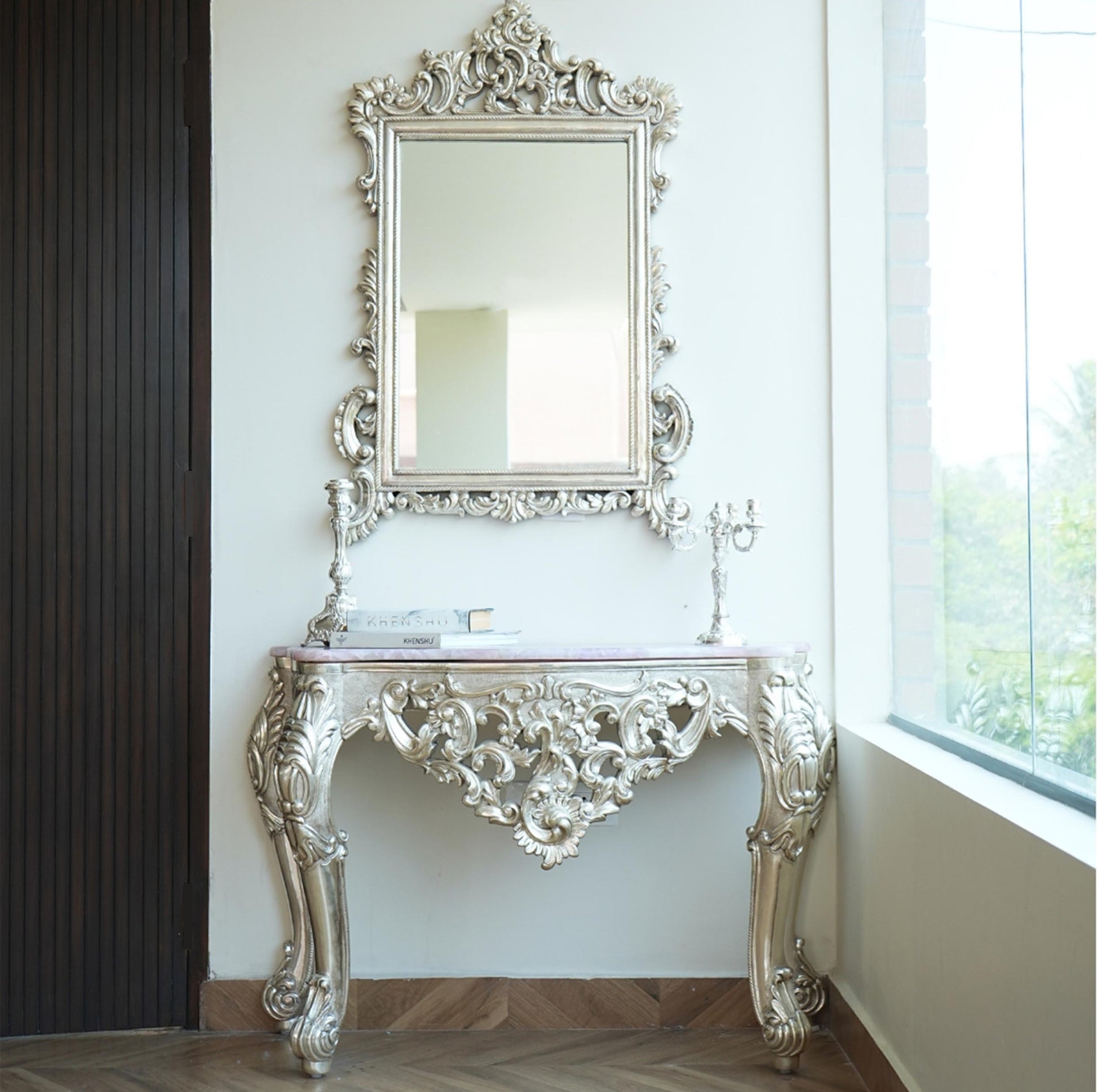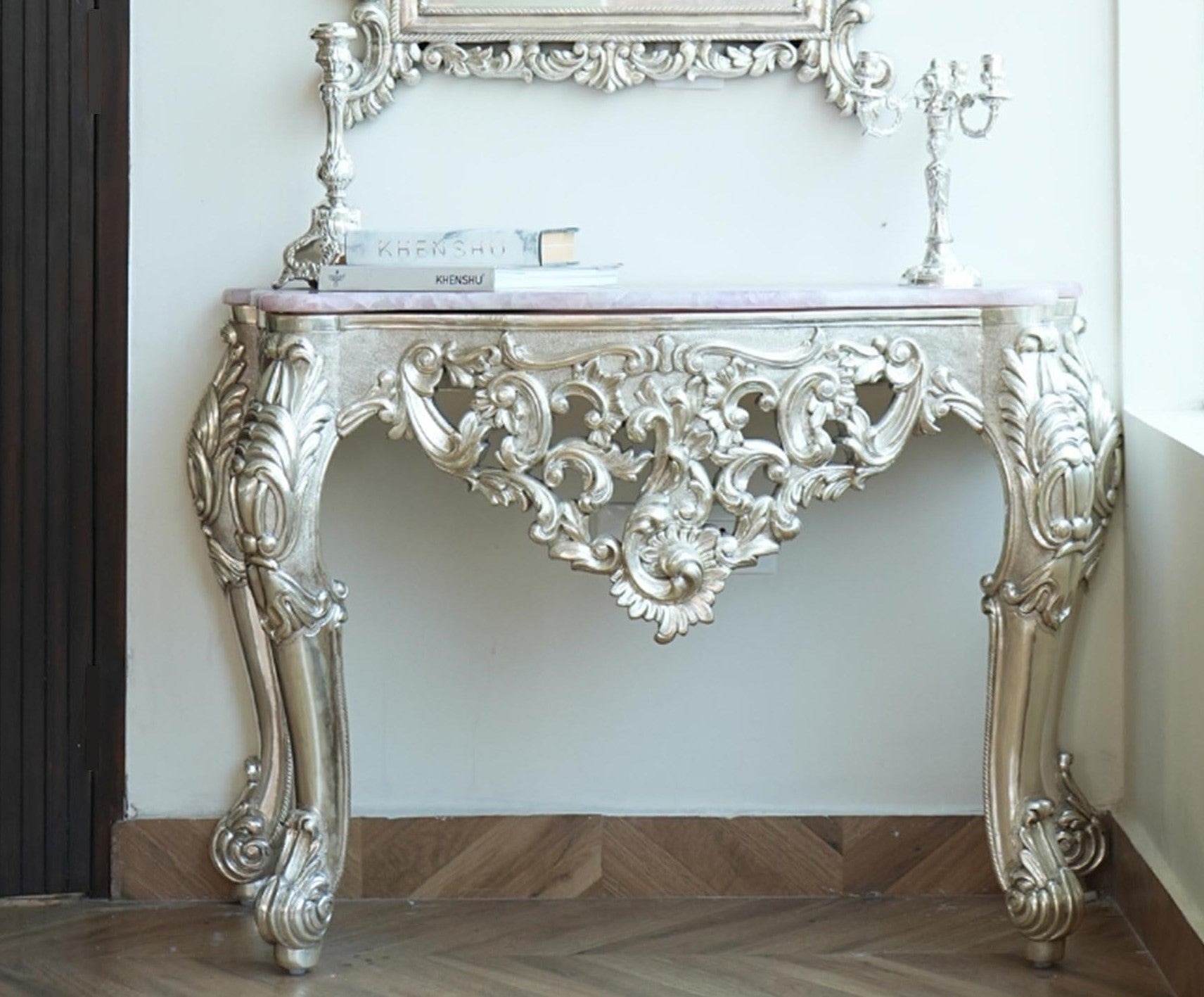 Our Rose Console comes topped in rose quartz, it displays perfectly finished, intricately carved details. Designed to radiate elegance and a soothing allure, it is sure to make a statement.