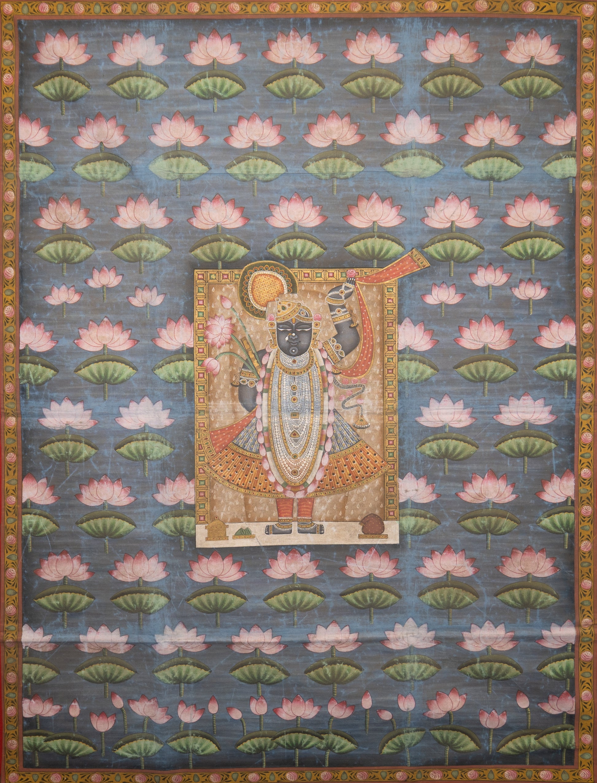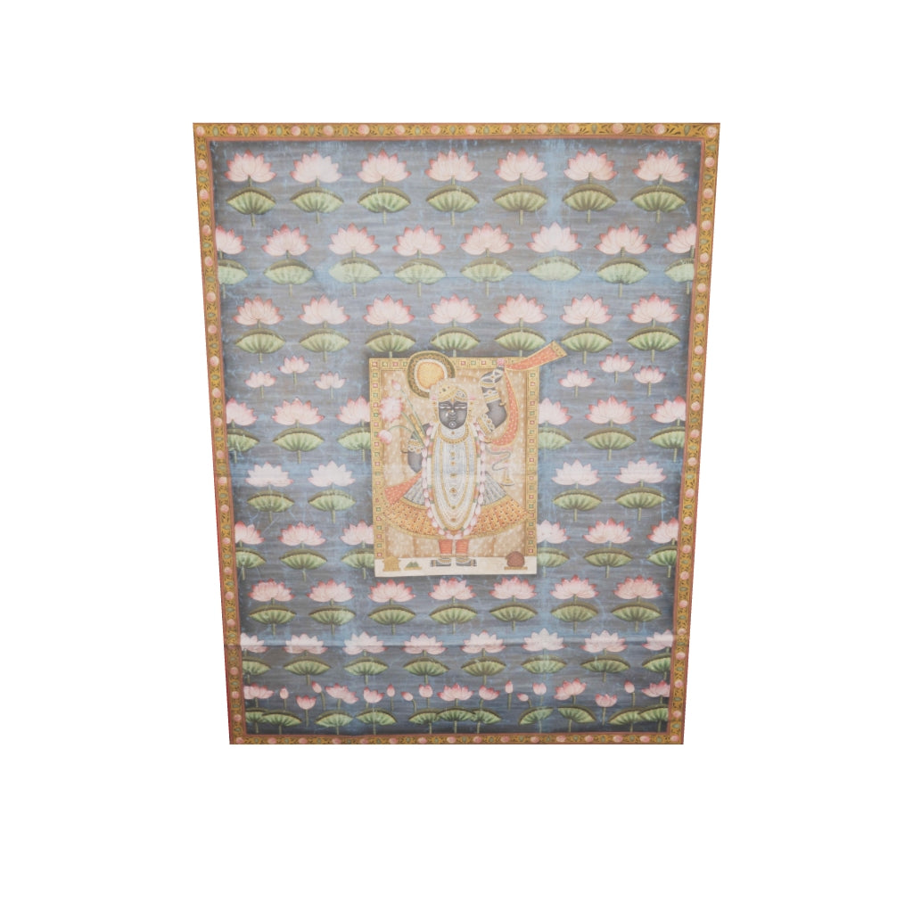 The sacred spruce painting depicts a quaint representation of lotus fields around the lord, it can aesthetically go with the living room or entryways in any house.